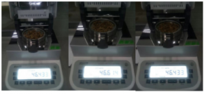 3.用實驗勺取6.643克重的氟化鈣礦粉(A3樣品)均勻鋪在樣品盤上,設置好合適的溫度后蓋下上蓋,按下“START”鍵開始測試;蜂鳴兩聲后,儀器自動停機,測試結束,可在液晶顯示屏查看測試后氟化鈣礦粉的水含量為10.011%;