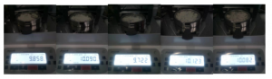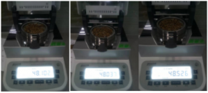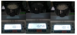 2.將防風盤、支架、樣品盤一一裝好,接通電源,按下開機鍵,顯示屏進入開機界面,首先按去皮鍵減去樣品盤重量,后將100g砝碼放入托盤進行校準;