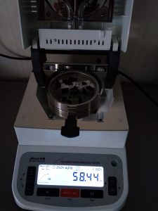 為了得到更精確穩定的數據結梅,在進行第二次測試過程前先等待話梅干水分儀降溫,待儀器本身溫度降至40度以下時,同樣取3克話梅干碎于不銹鋼托盤中,將話梅干碎平鋪均勻,這次我們把溫度設定在160℃,按“START”鍵開始測試,30分08秒后檢測結束,檢測數據顯示58.82%;